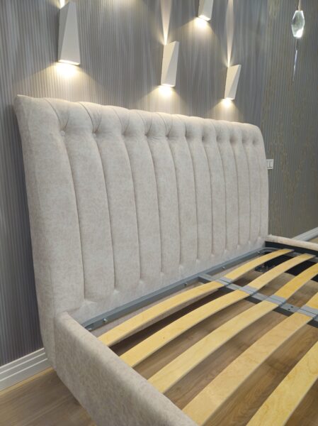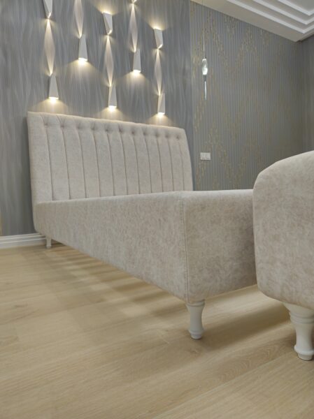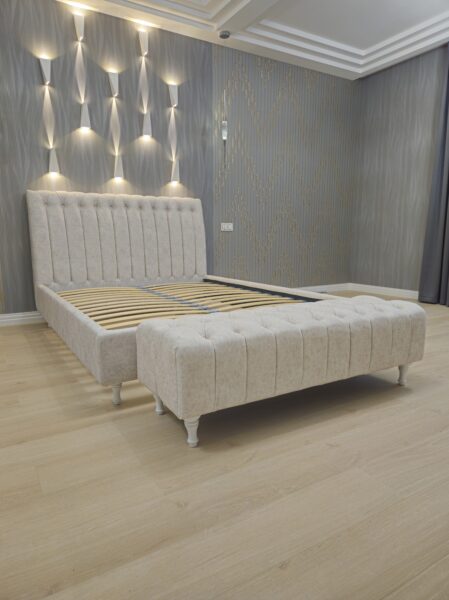 Двуспальная кровать на ножках с банкеткой и мягкой обивкой — элегантное и функциональное решение для спальни, объединяющее стиль, комфорт и практичность.